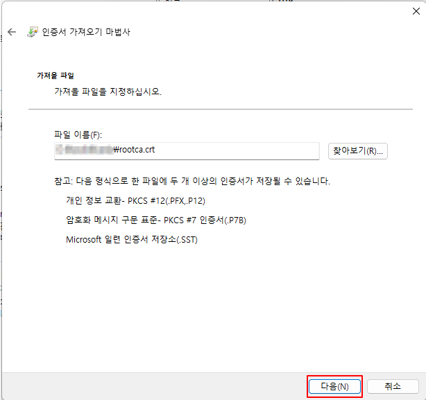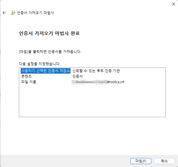 즉, 이 인증서가 적용되기 위해서는 rootca 인증서를 신뢰할 수 있는 루트 인증 기관으로 등록하는 작업을 한번 거쳐야 합니다.